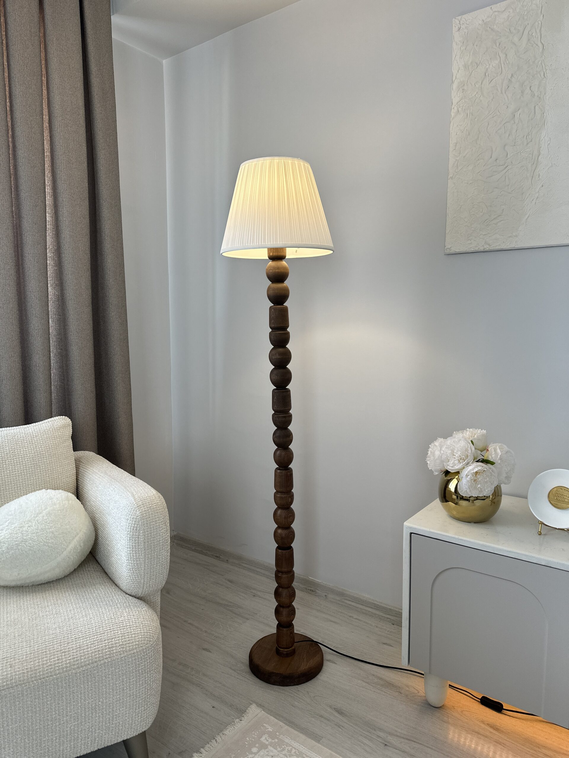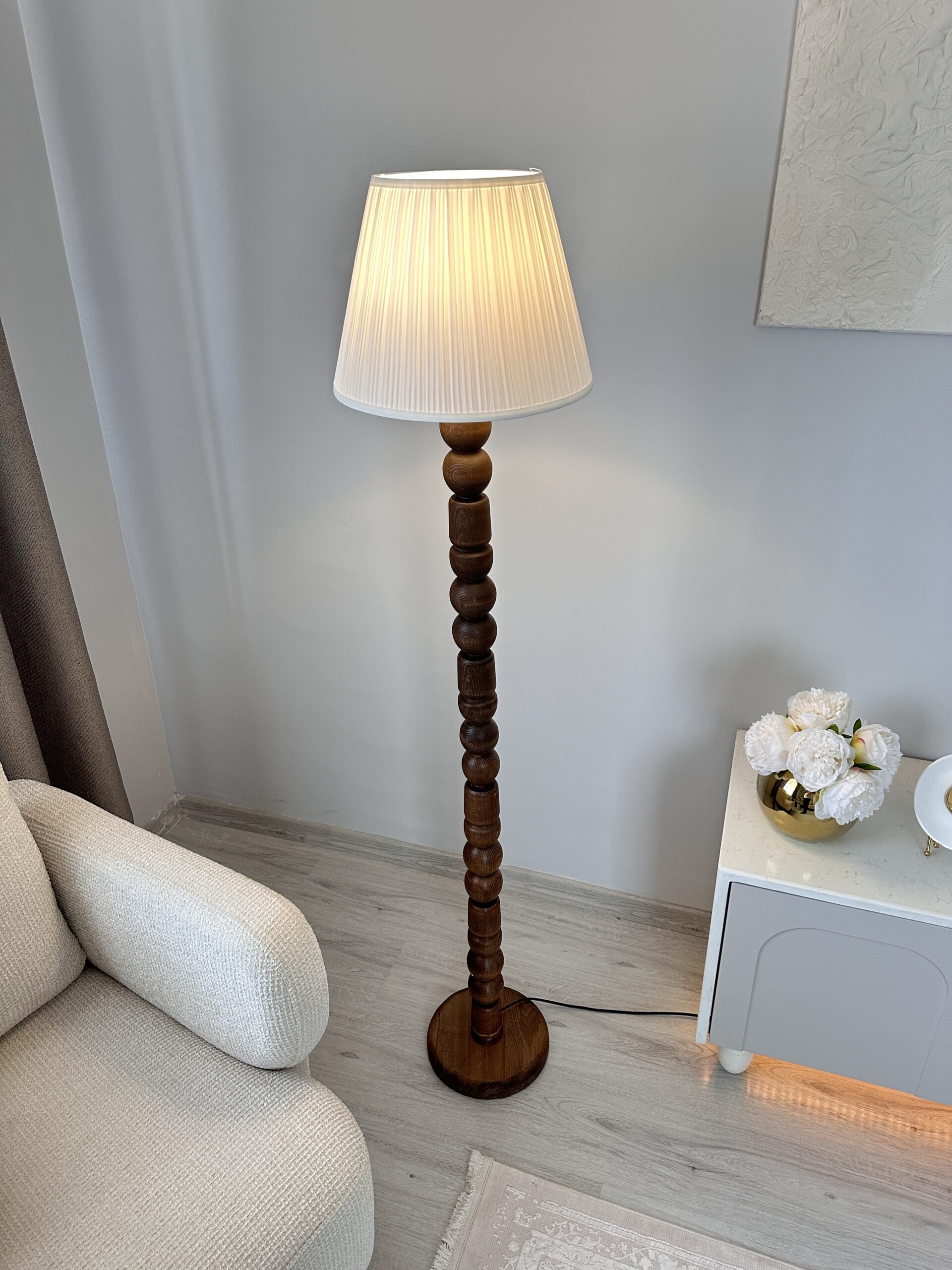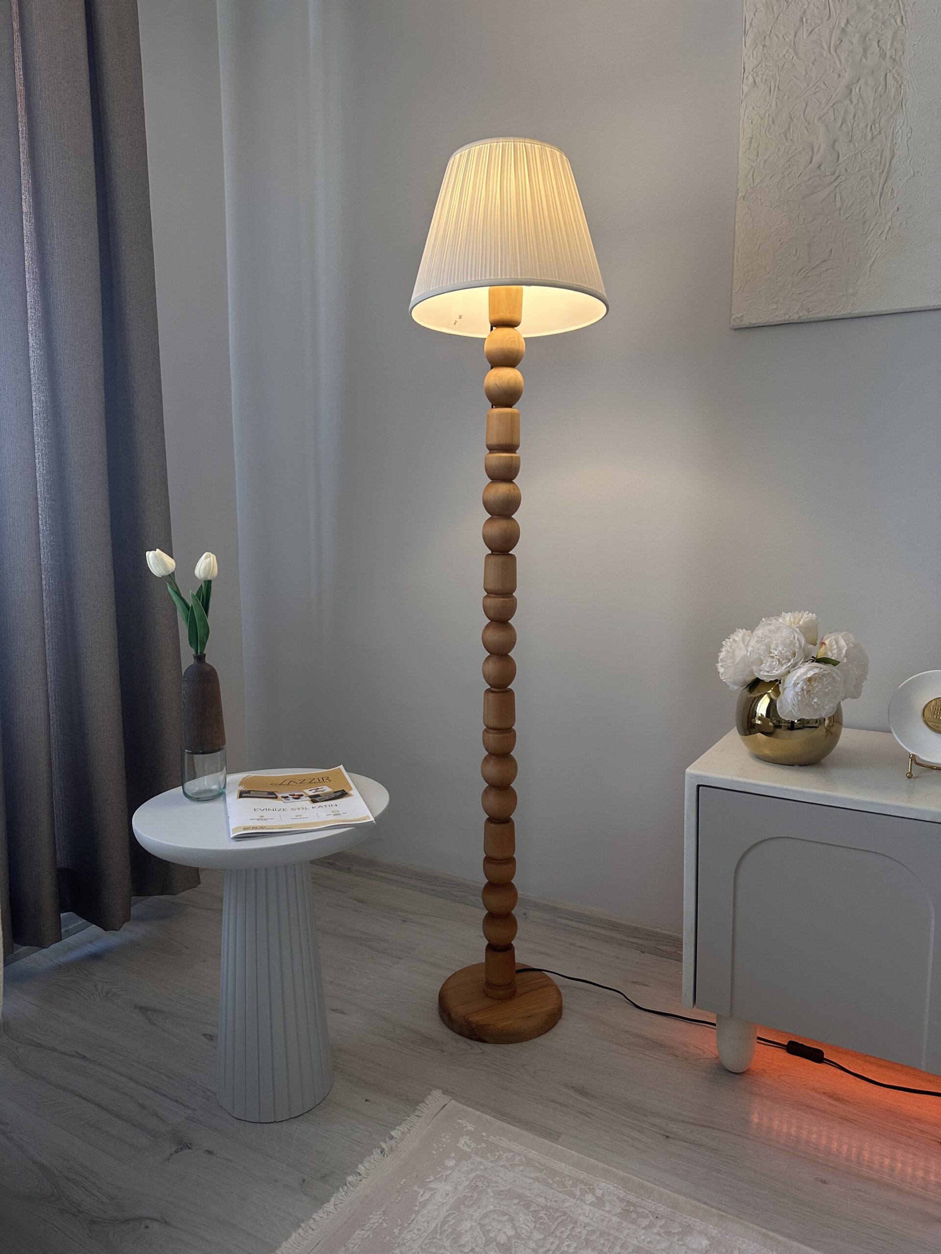 Doğal ahşap tasarıma sahip şık lambader. Ceviz ve doğal renk seçenekleriyle salon, oturma odası veya ofis dekorasyonunuza sıcak bir ambiyans katar. Başlıklı veya başlıksız kullanım imkânı.