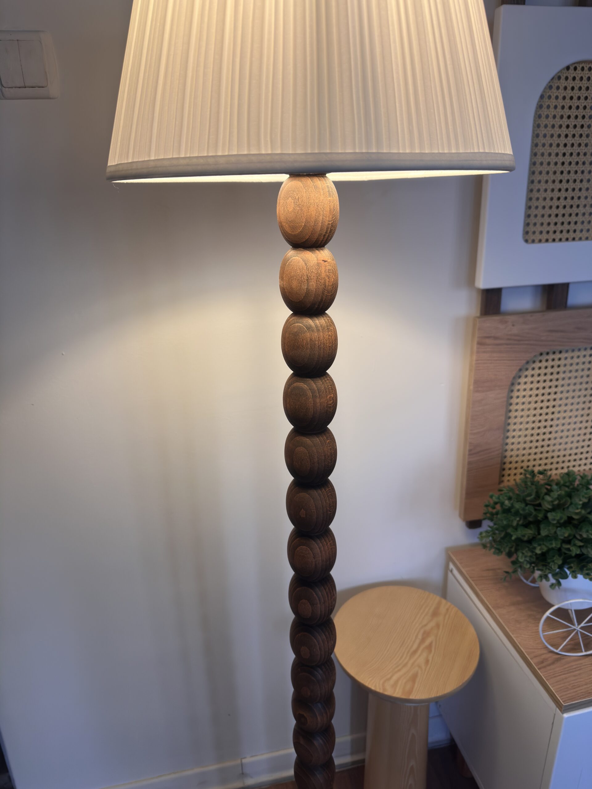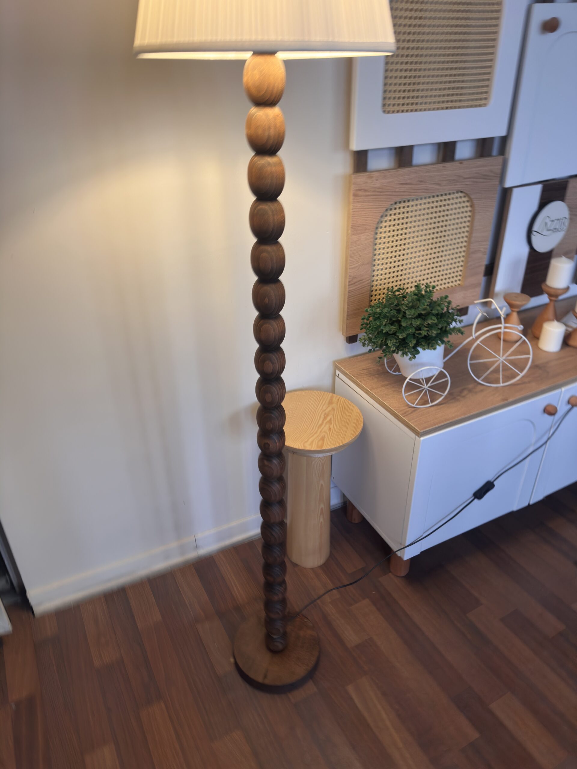 Doğal ahşap tasarıma sahip şık lambader. Ceviz ve doğal renk seçenekleriyle salon, oturma odası veya ofis dekorasyonunuza sıcak bir ambiyans katar. Başlıklı veya başlıksız kullanım imkânı.